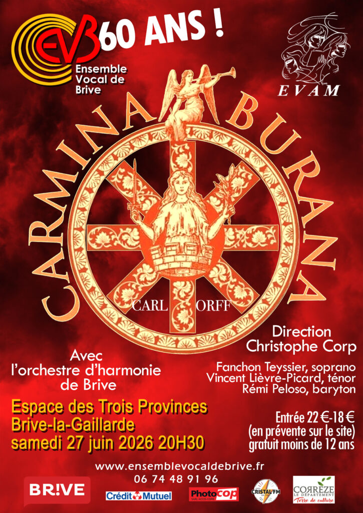 Pour l’occasion, l’EVB chantera les célèbres Carmina Burana de Carl Orff, accompagné par l’Ensemble vocal Arnaut de Mareuil, de Périgueux, et l’Harmonie Sainte-Cécile de Brive.